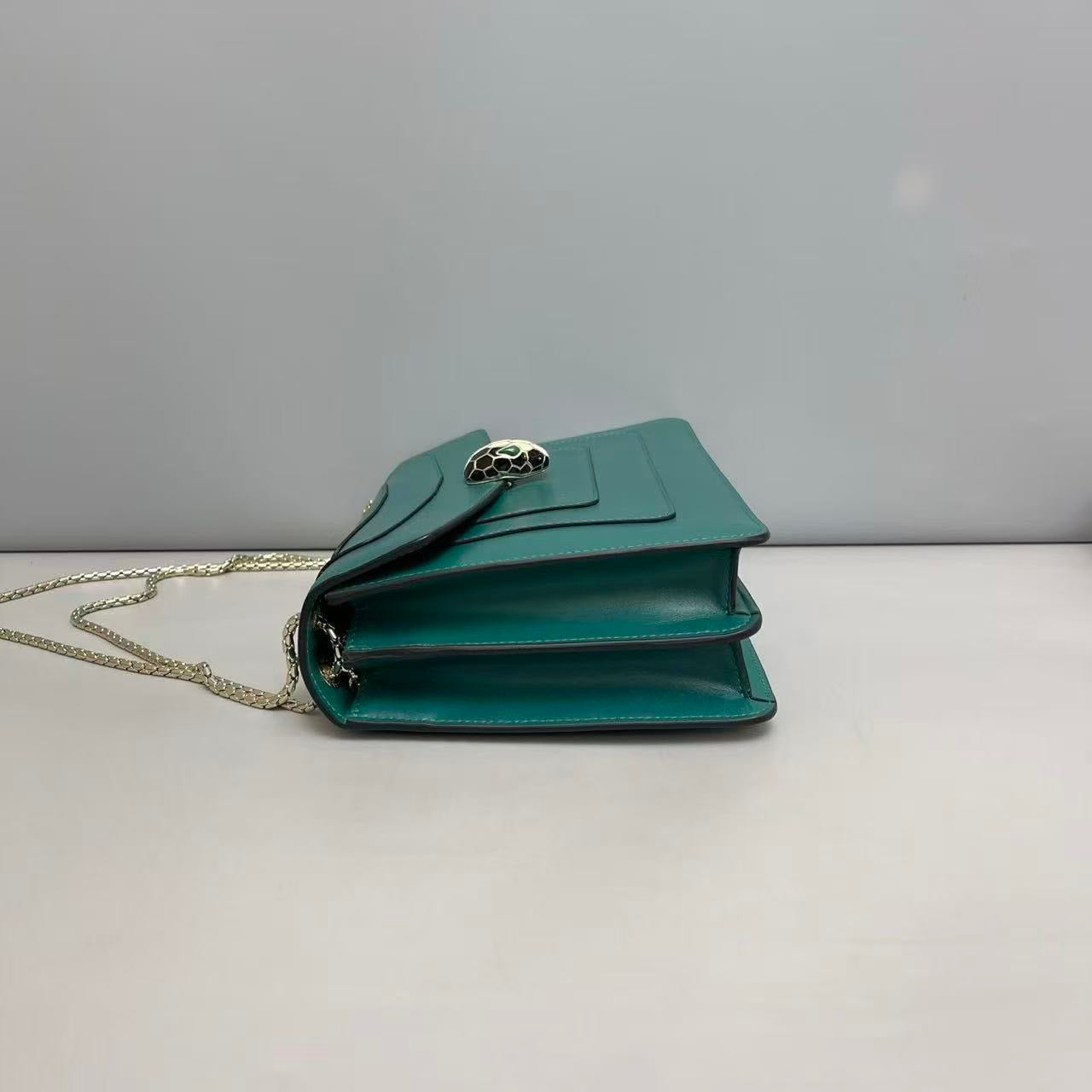 This BVLGARI Serpenti medium bag is crafted in luxurious emerald green leather, featuring the iconic Serpenti snake-head clasp that represents the brand’s bold Roman heritage. The structured silhouette offers an elegant balance between statement design and everyday practicality. Measuring approximately 27 × 18 cm, the bag provides ample space for daily essentials while maintaining a refined, sophisticated presence.