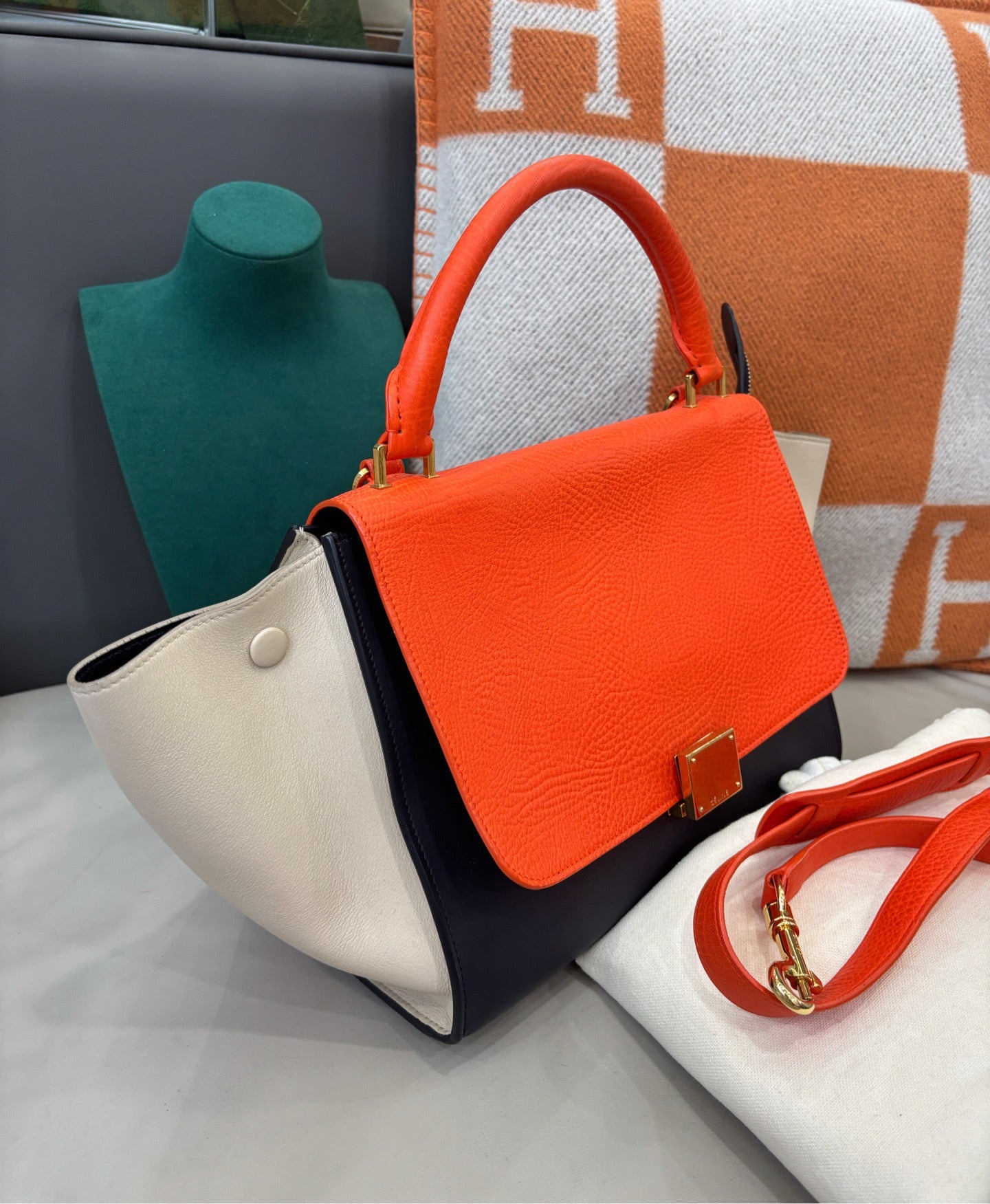 This CELINE small Tie bag is crafted in refined colorblock leather, showcasing the brand’s signature winged silhouette and structured elegance. The balanced proportions offer both visual impact and everyday practicality. Measuring approximately 27 × 21 cm, the bag provides sufficient space for daily essentials while maintaining a clean, sophisticated profile.