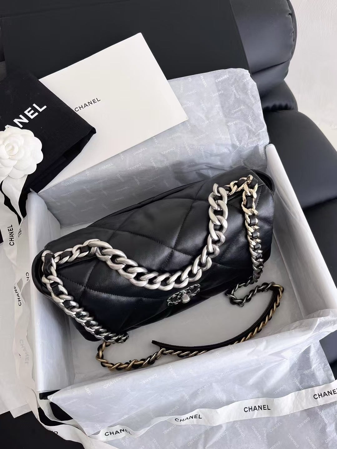 This Chanel 19 medium bag is crafted in black leather, finished with signature mixed-chain detailing and silver-tone hardware that defines the modern elegance of the Chanel 19 line. The softly structured silhouette offers both visual impact and everyday practicality, making it a versatile choice for daily wear and elevated styling.