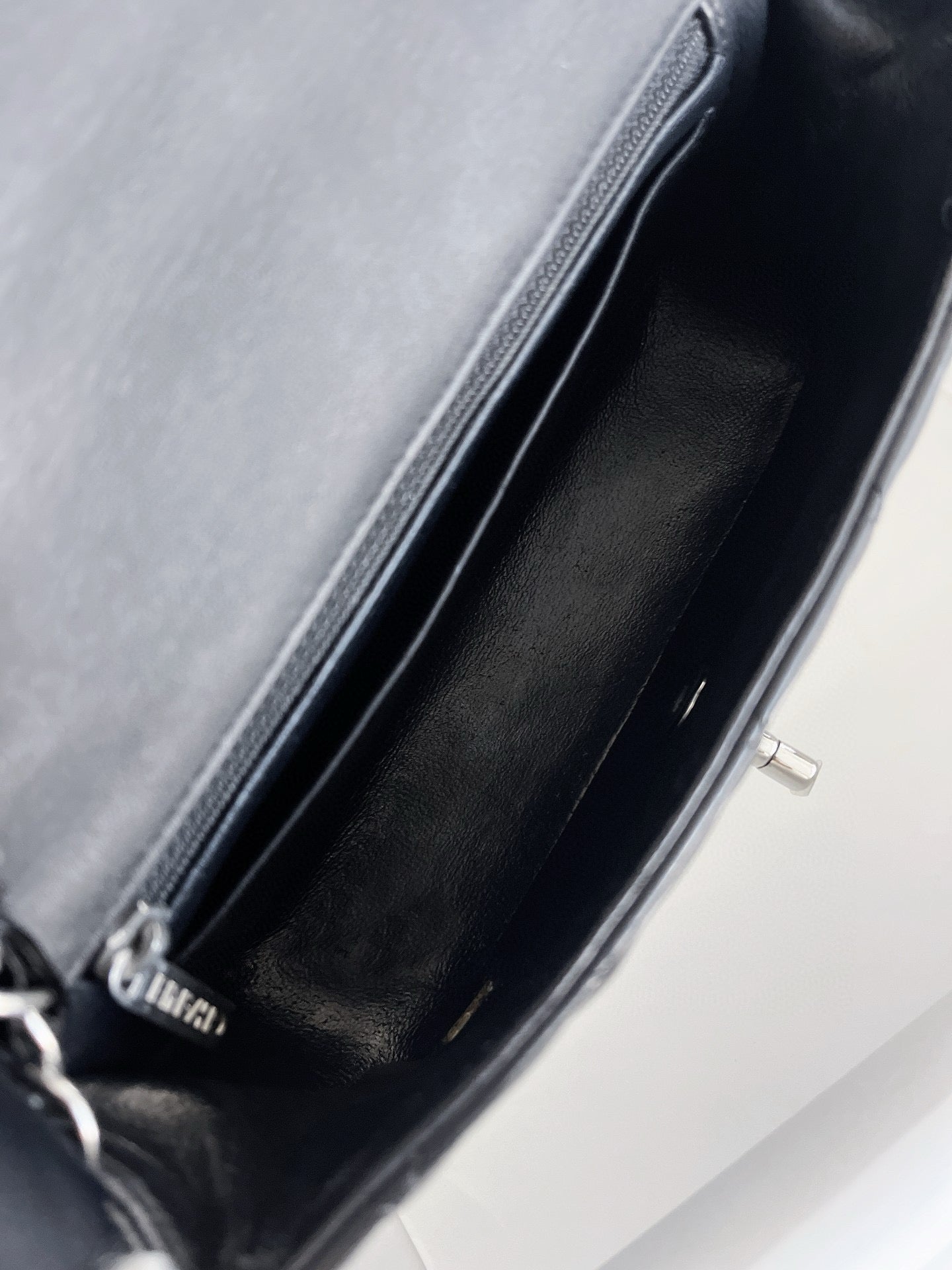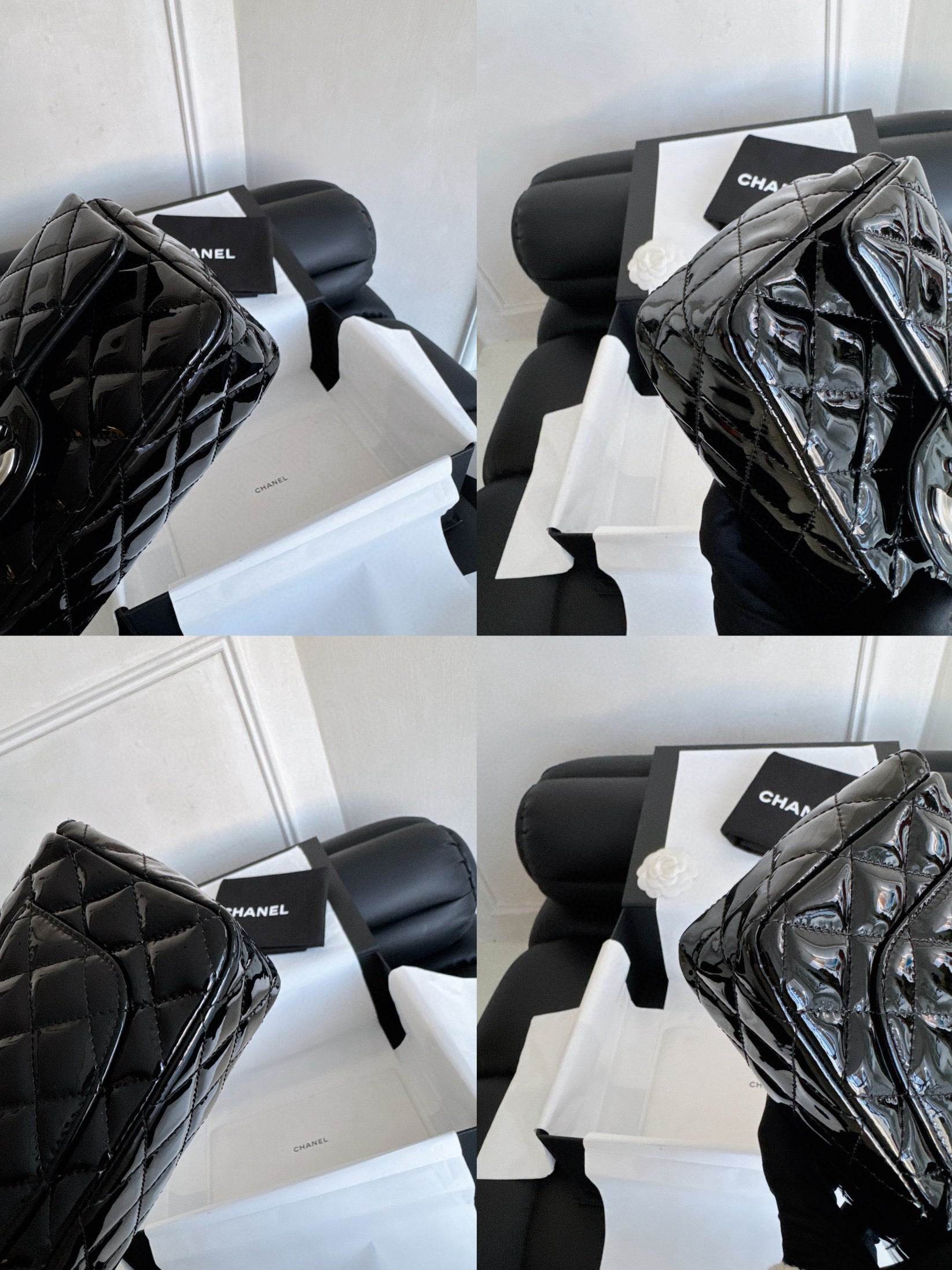 This Chanel Classic Flap large mini is crafted in glossy black patent leather, paired with sleek silver-tone hardware that gives the iconic CF design a modern, statement-ready edge. The structured silhouette and reflective finish make it especially suitable for evening wear while remaining timeless and recognizable as a Chanel classic. Measuring approximately 20 × 12 cm, the bag offers a compact yet functional interior for essentials.