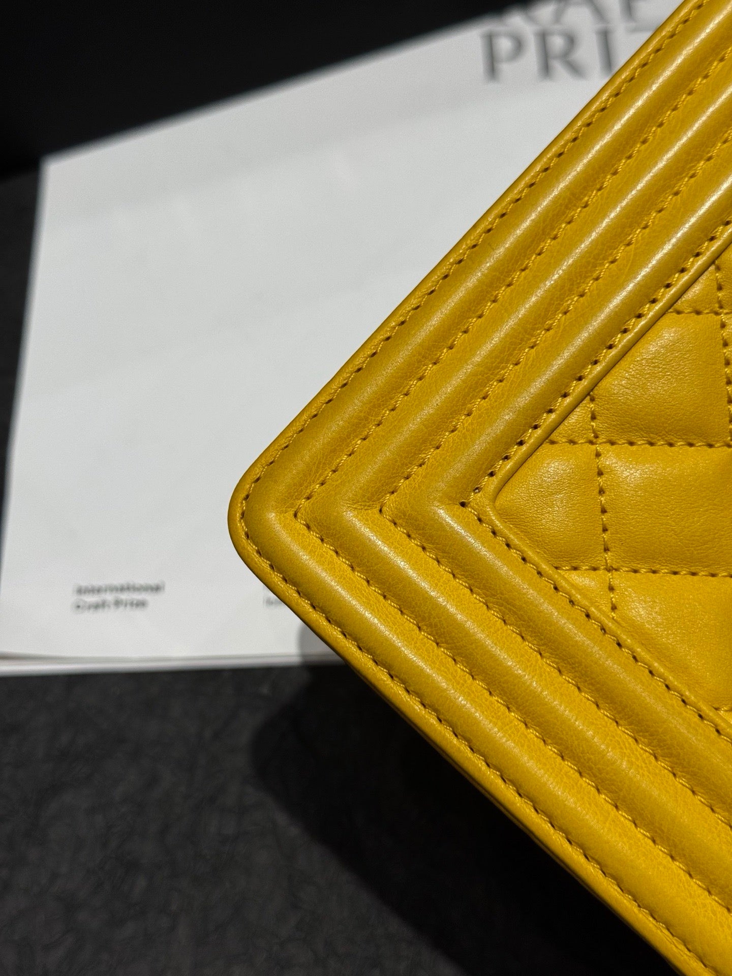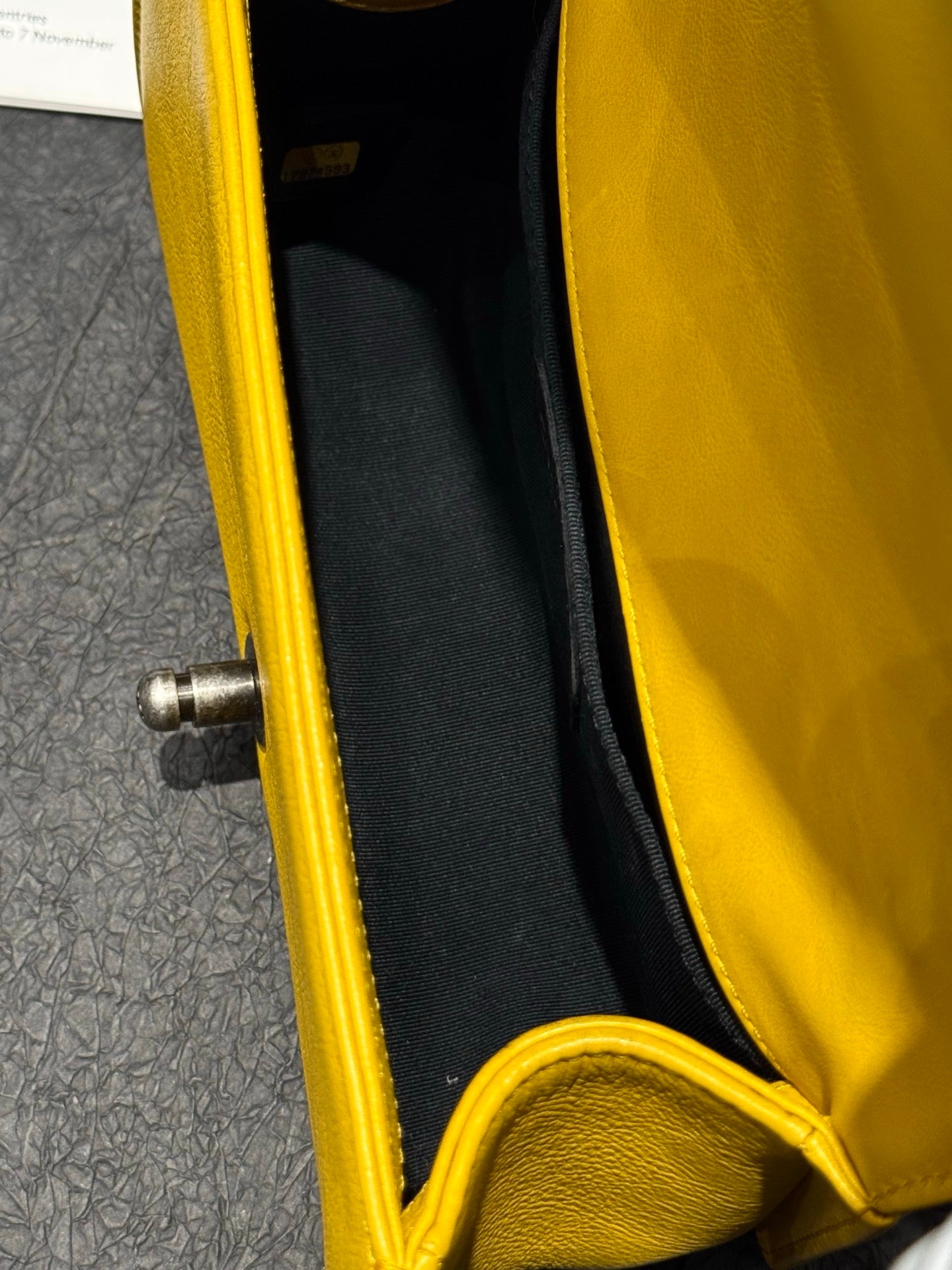 A modern Chanel Le Boy small crafted in smooth calfskin, featuring a bold chain strap accented with a bright yellow detail for a fresh, contemporary touch.