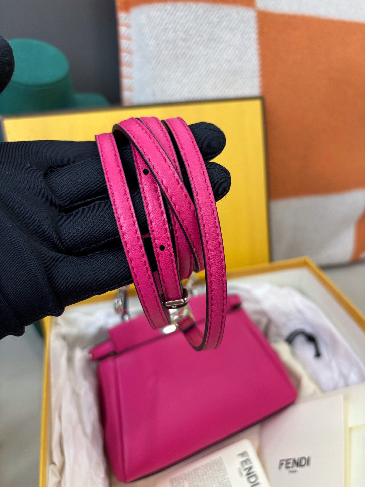 This Fendi Peekaboo Mimi bag is crafted in vibrant rose pink leather, featuring the brand’s iconic Peekaboo silhouette in a compact, refined form. The structured design maintains its shape beautifully, offering both elegance and practicality. Measuring approximately 15 × 10 cm, the bag is ideal for carrying small essentials while adding a bold yet polished statement to any look.