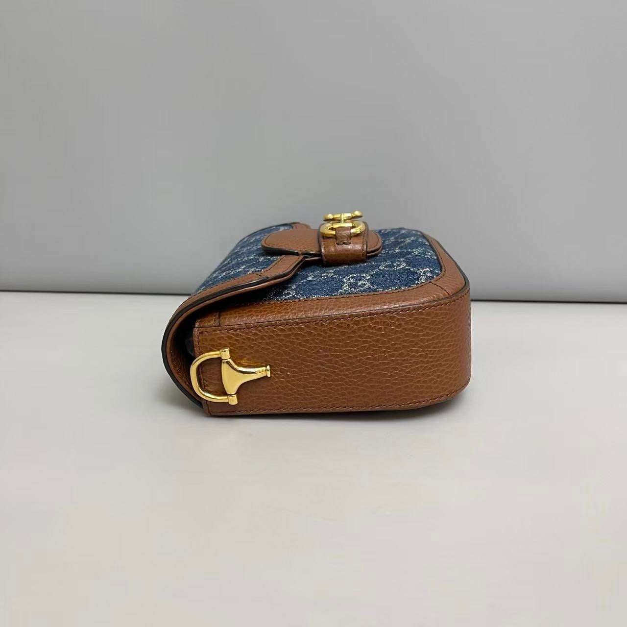 A stylish Gucci 1955 mini saddle bag crafted in signature GG canvas, accented with denim details and warm caramel leather trim.