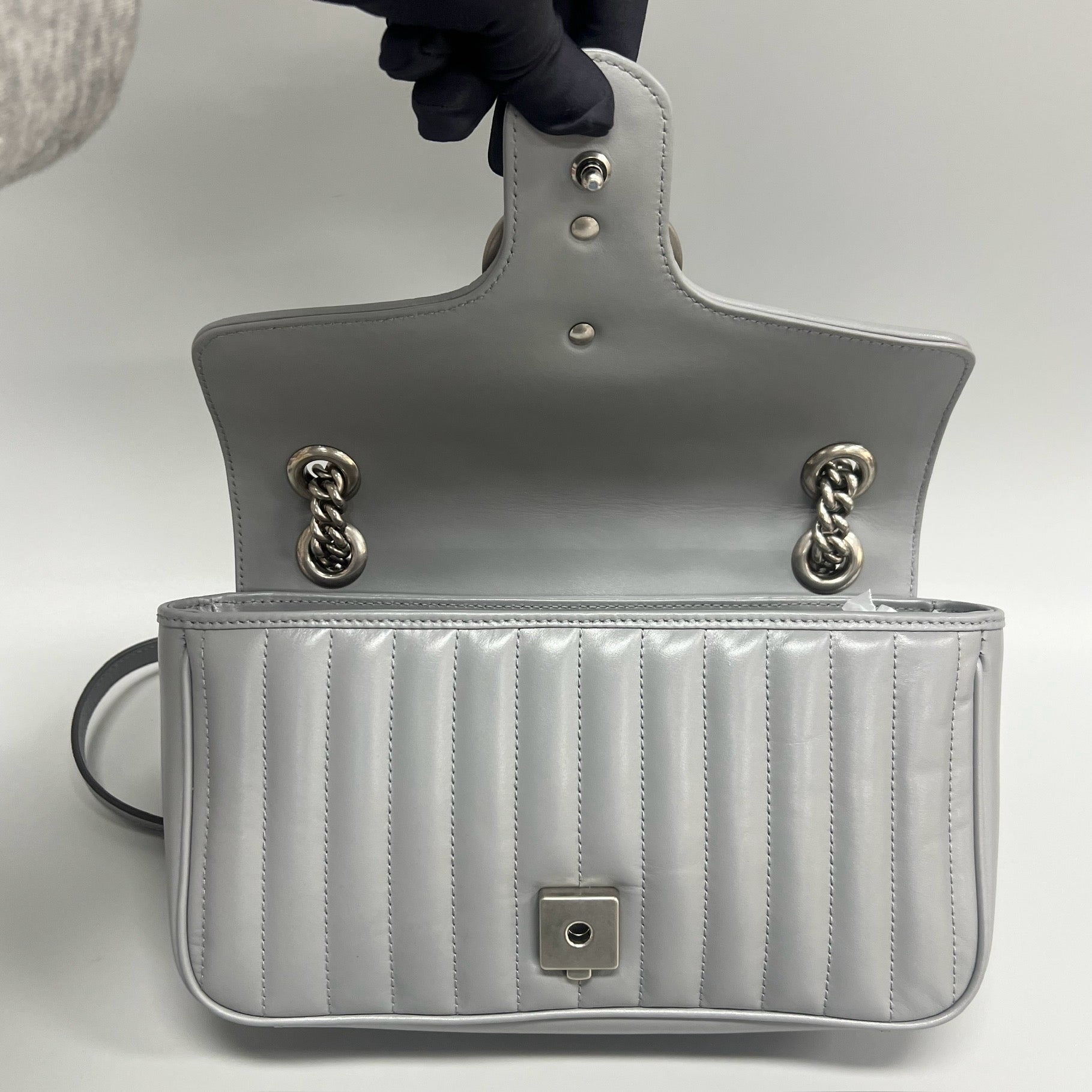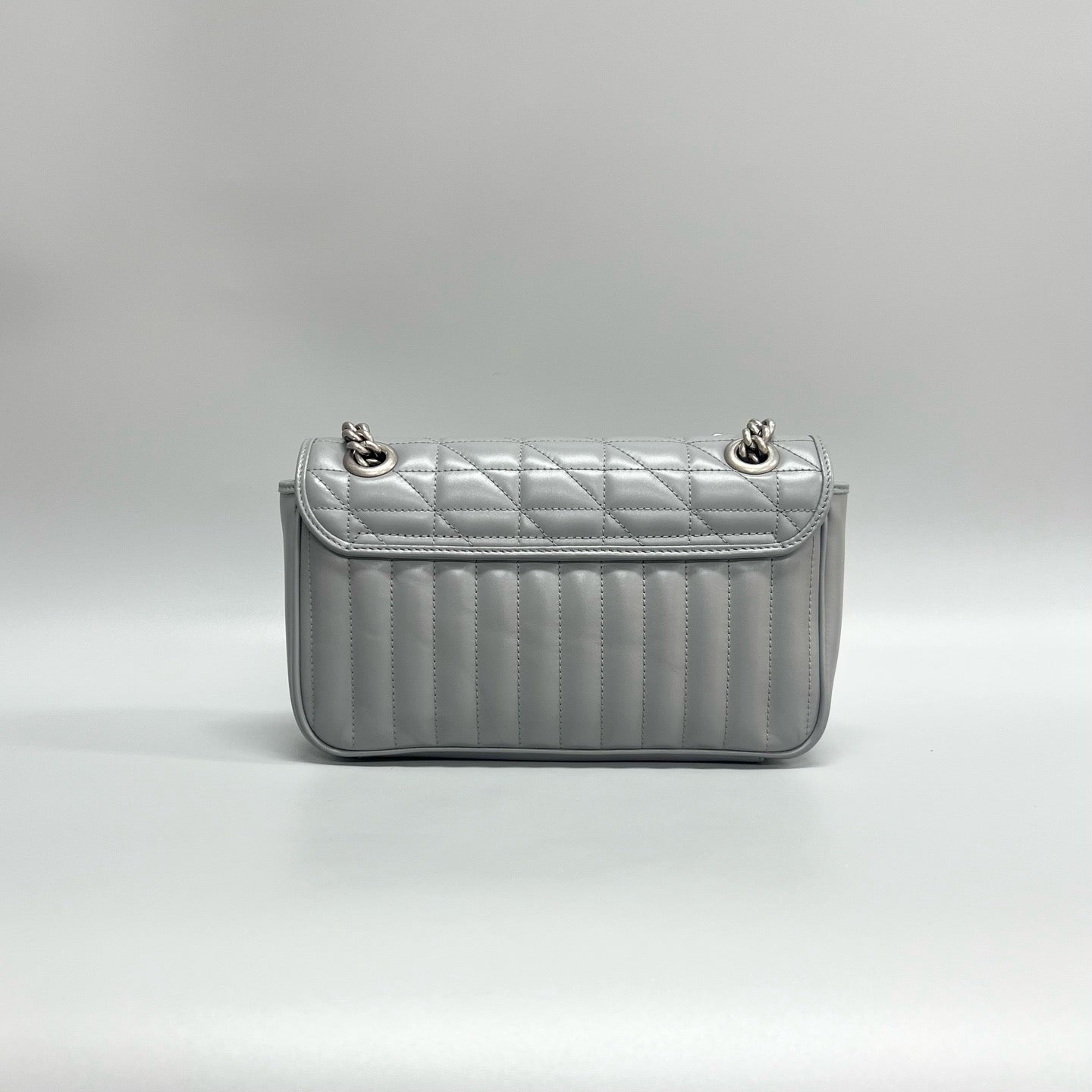 A modern Gucci Marmont 26 crafted in elegant grey leather with vertical quilting, finished with a sleek silver-tone Double G logo.