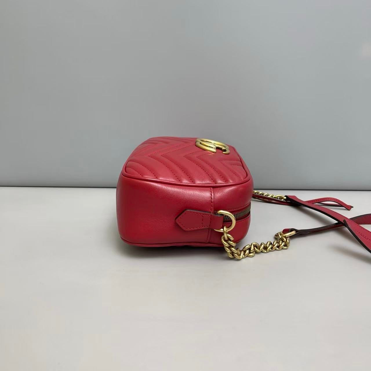 A classic Gucci Marmont camera bag in vibrant red leather, finished with the iconic Double G hardware.