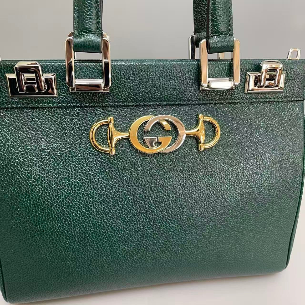 A refined Gucci Zumi small bag crafted in elegant dark green pebbled leather, featuring a structured silhouette with subtle gold-tone hardware.