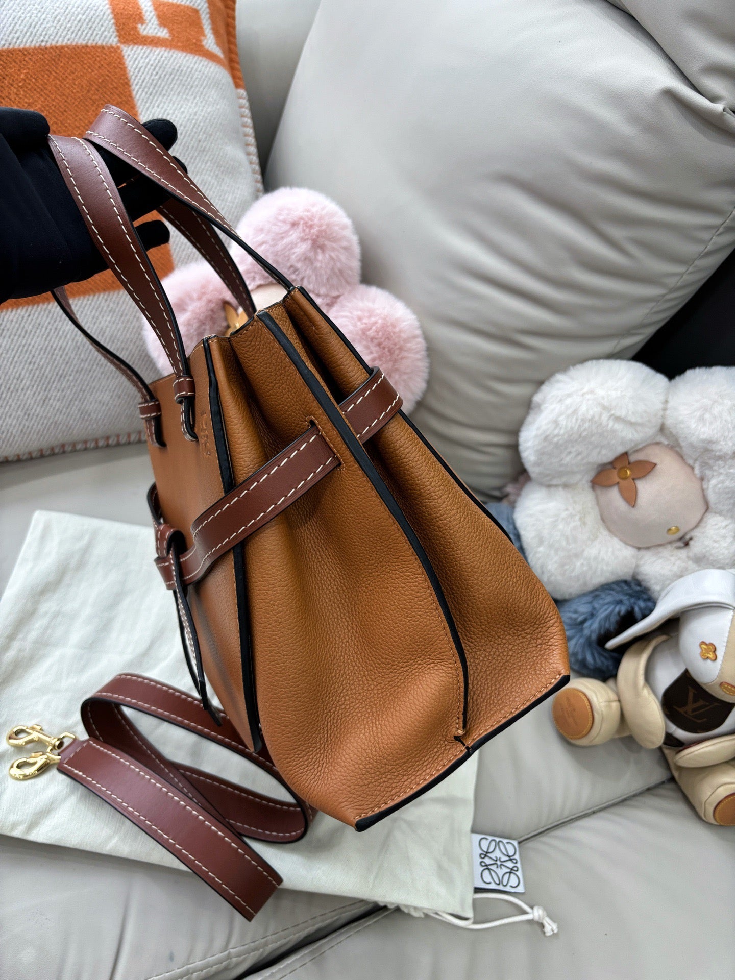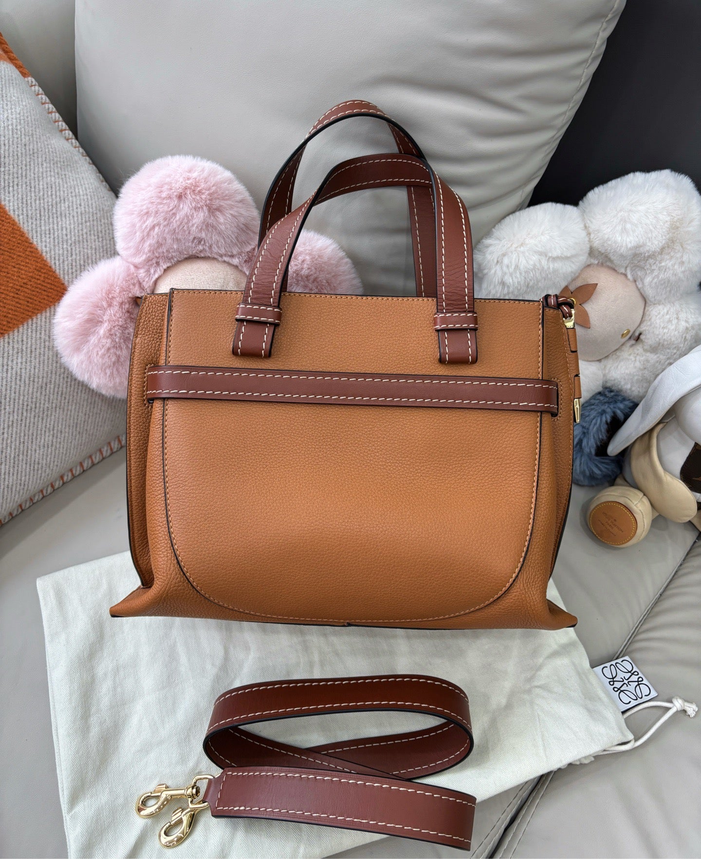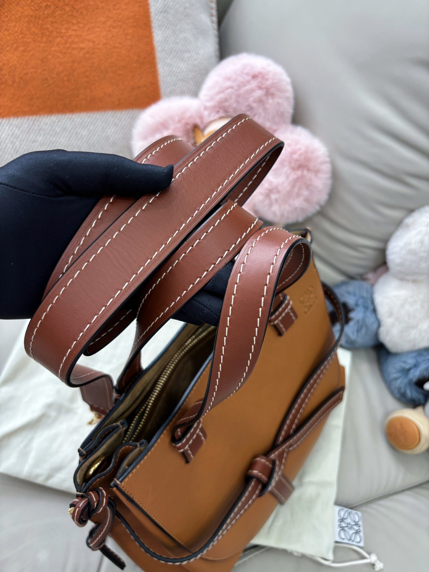 This LOEWE Gate top handle small bag is crafted in rich caramel leather, widely regarded as one of the most flattering and versatile colorways of the Gate line. The structured yet softly contoured silhouette balances visual elegance with everyday practicality. Measuring approximately 30 × 22 cm, the bag offers ample space for daily essentials while maintaining a refined, polished presence—ideal for both casual and elevated styling.