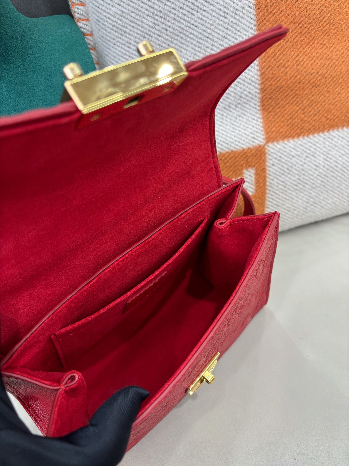 A stunning Louis Vuitton Saint Sulpice in vibrant red leather, featuring a sleek chain strap and elegant LV clasp.