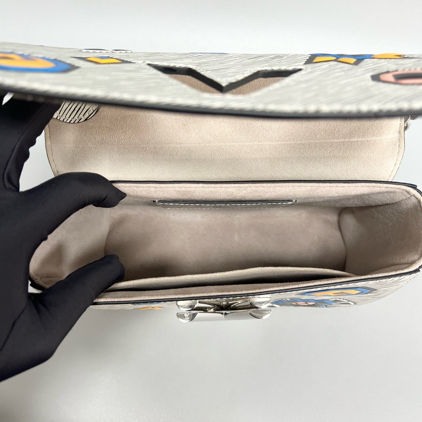 This Louis Vuitton Twist medium chain bag is a limited-edition piece crafted in black and white Epi leather, featuring a distinctive graffiti-style design that adds a bold, contemporary edge to the iconic Twist silhouette. The textured Epi leather enhances durability while maintaining a refined finish. Measuring approximately 23 × 17 cm, the bag offers a practical interior suitable for daily essentials and statement styling.