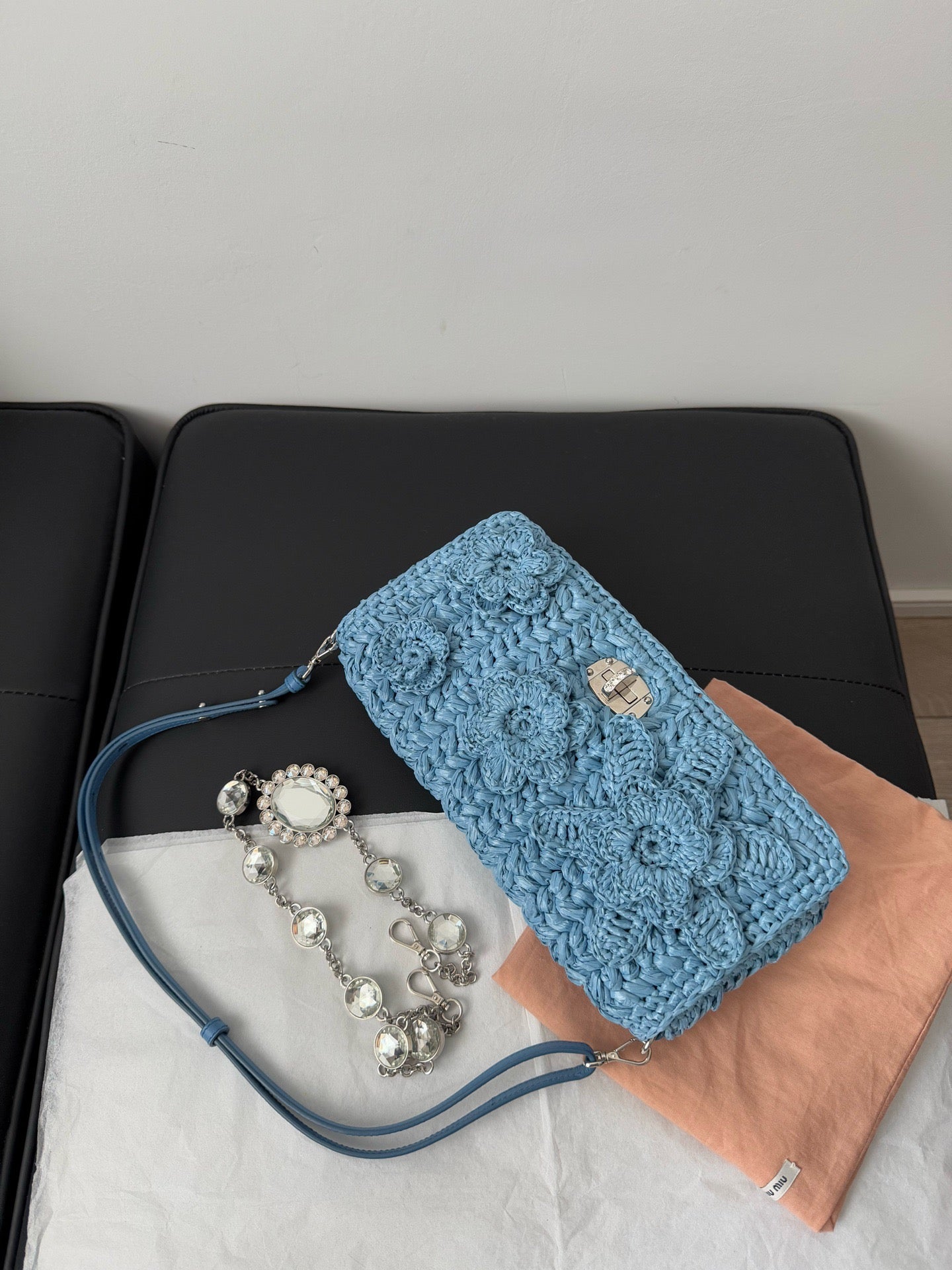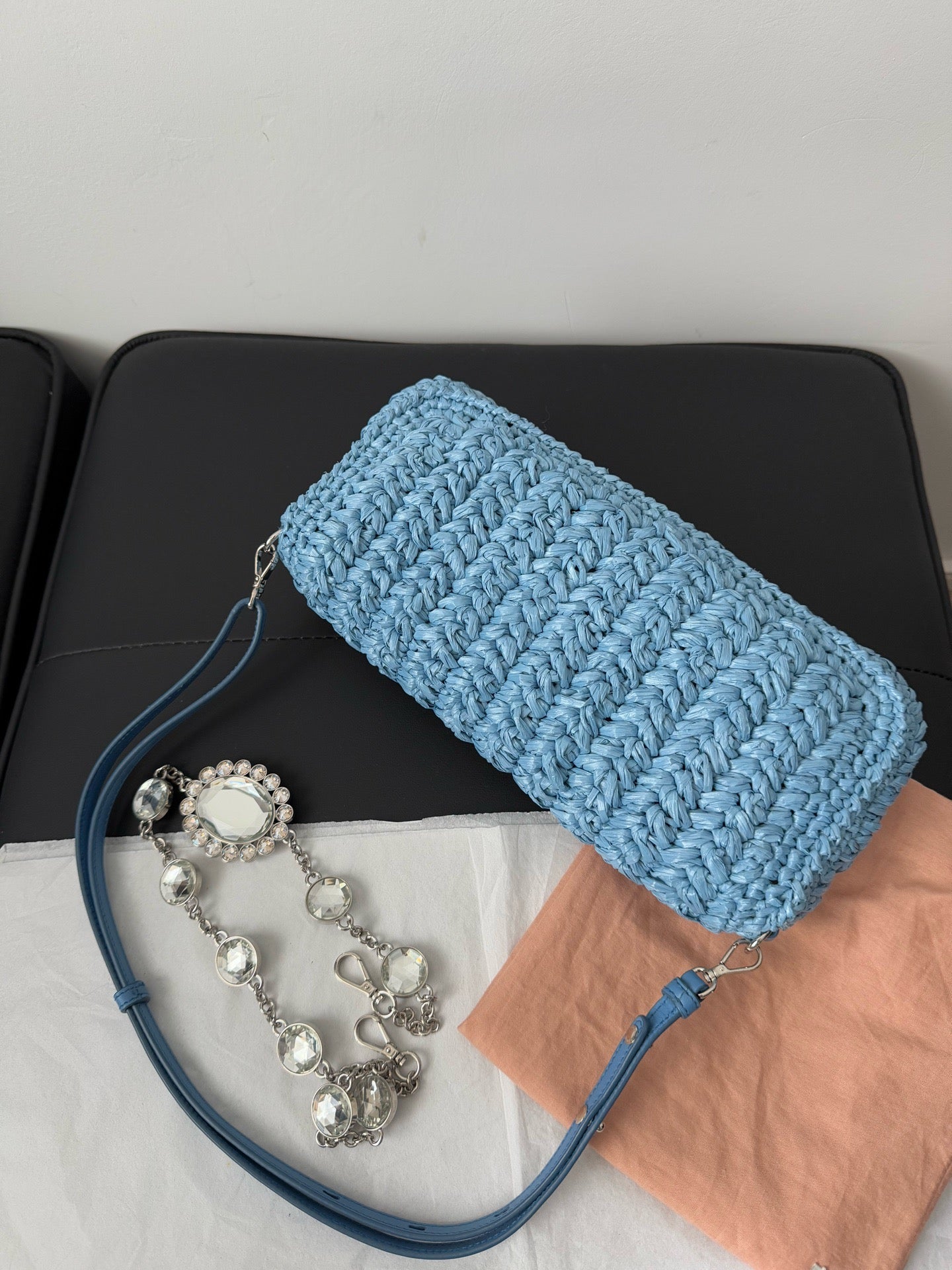 A charming and fashion-forward Miu Miu shoulder bag crafted in baby-blue raffia and embellished with sparkling crystal details for a soft yet striking look.