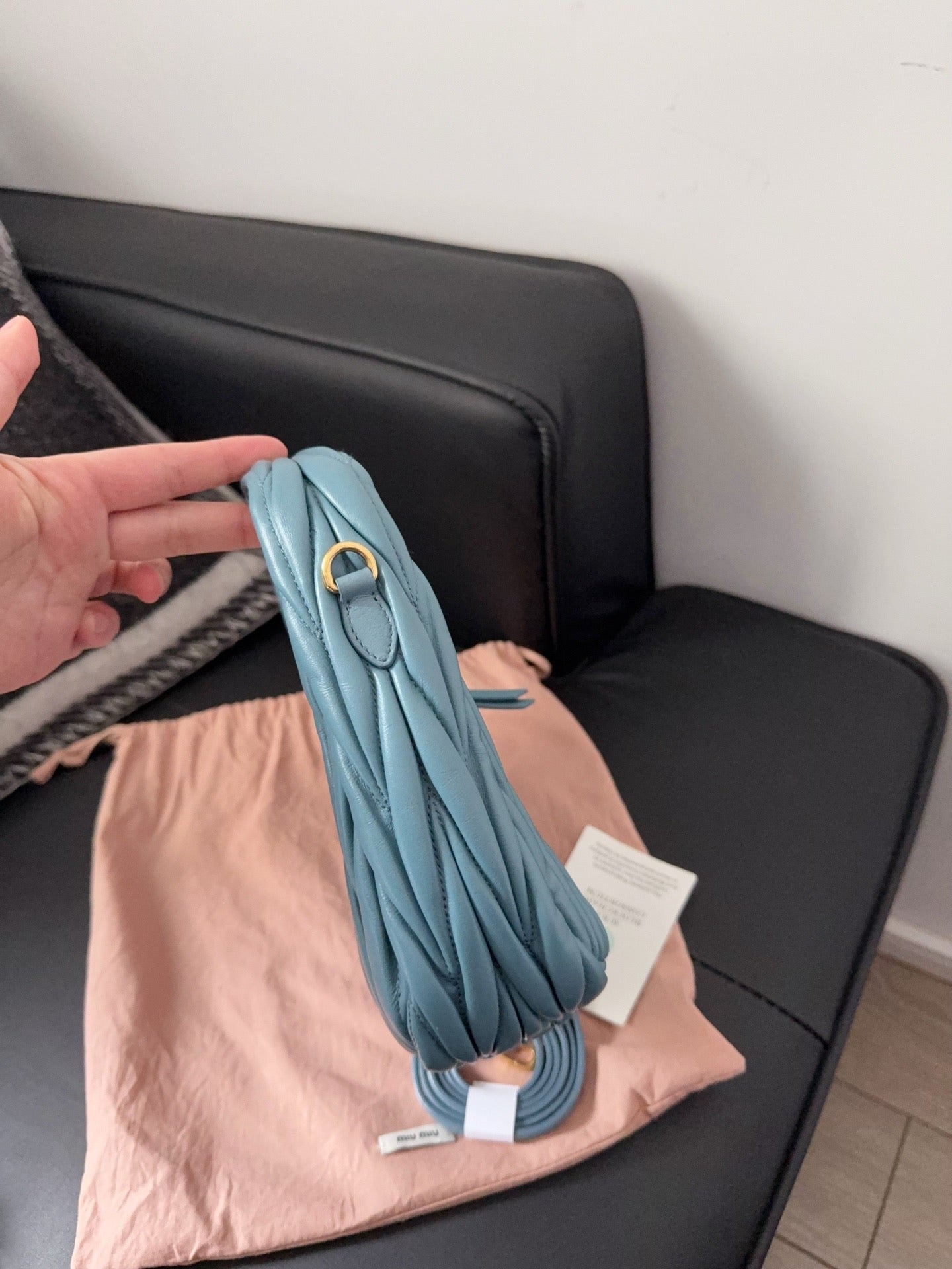 A playful yet polished Miu Miu Wander Small Hobo crafted in a vibrant blue tone that instantly elevates any outfit.