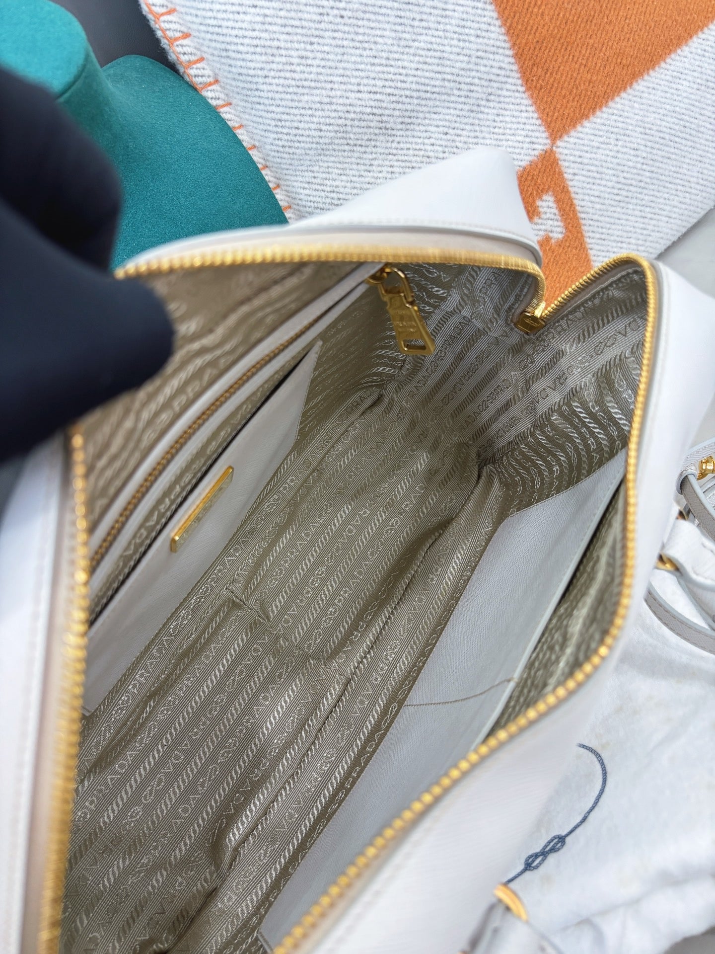A beautifully structured Prada Plum 30 crafted in luxurious white Saffiano leather, known for its durability, elegance, and timeless texture.